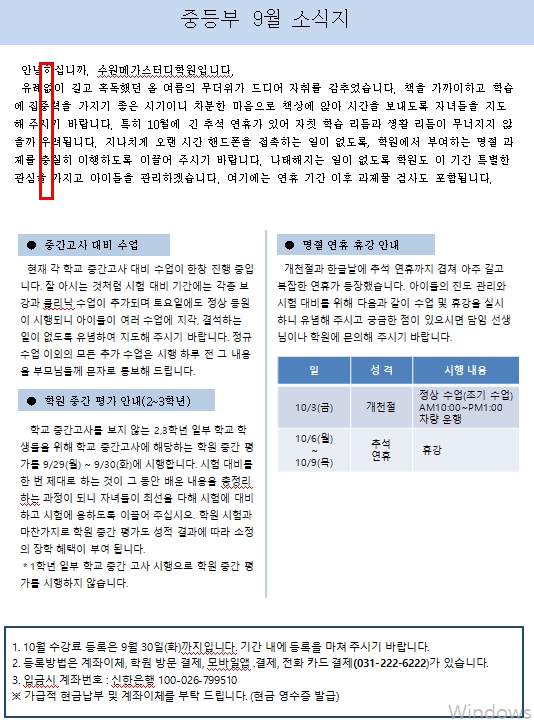 2025년 중등부 9월 소식지(가정통신문) 페이지 정보 작성자 최고관리자 작성일 25-09-19 21:17 조회 264회 댓글 0건 본문 * 10월 등록은 9월 30일(화)까지입니다.