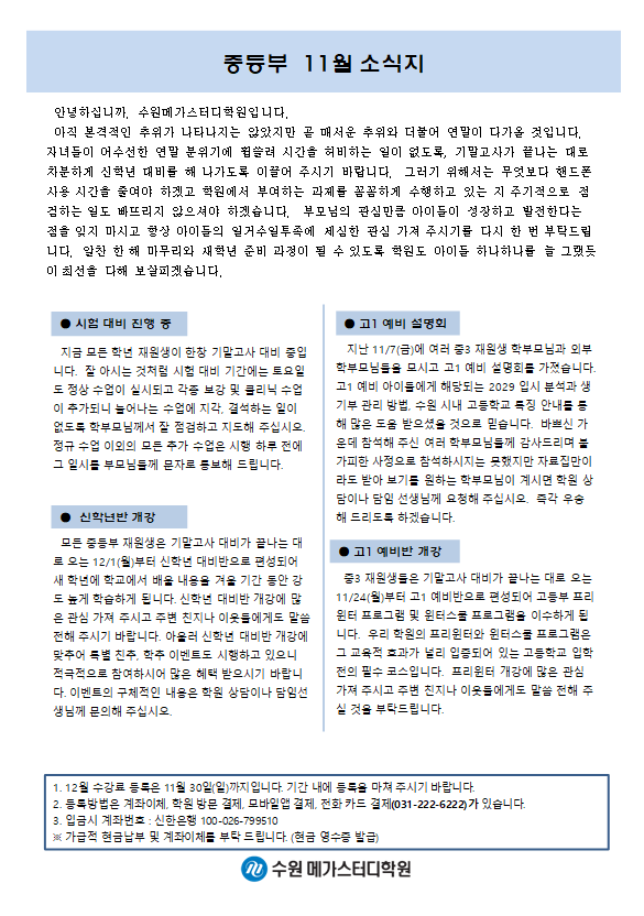 대표 : 김기주 사업자 등록번호 : 124-87-06470 개인정보 보호책임자 : 김기주 주소 : 경기도 수원시 권선구 권광로 90 대표번호 : 031-222-6222 Fax : 031-898-9994