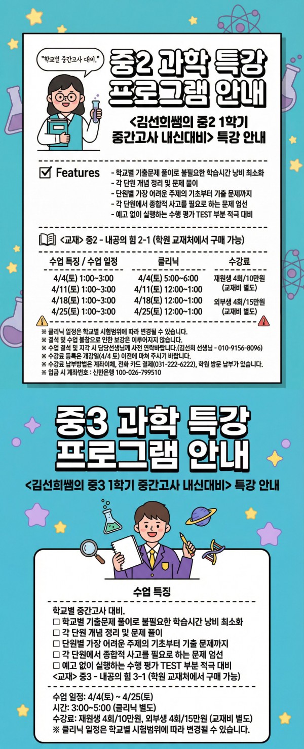 중등 1학기 과학 내신대비 프로그램 개강 안내 페이지 정보 작성자 최고관리자 작성일 26-03-12 15:41 조회 324회 댓글 0건 본문 중등 1학기 과학 내신대비 프로그램 개강 안내