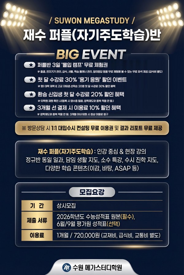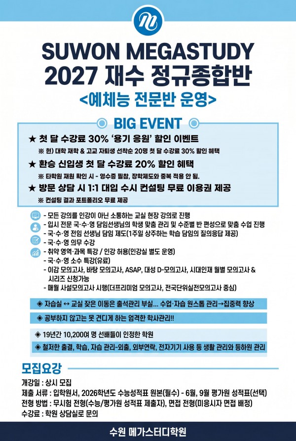 재수 2027 대입 재수정규반 특별 이벤트 안내 페이지 정보 작성자 최고관리자 작성일 26-04-22 16:58 조회 86회 댓글 0건 본문 2027 대입 재수정규반 특별 이벤트 안내
