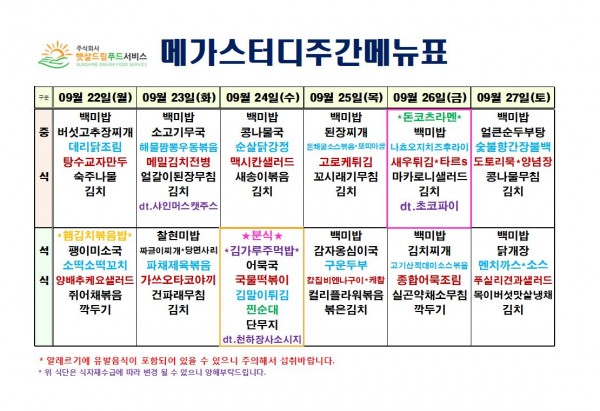 9월 4주차 식단표(9/22~9/27)